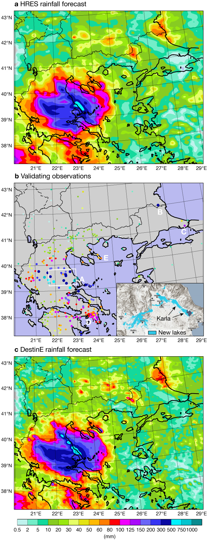 Figure 6 shows that the overall pattern, with the most extreme rainfall in central Greece (b), is well captured in HRES (a) and even better in DestinE (c). Indeed, DestinE does better near Portaria (see label A on Figure 6b) with higher peaks, and a tendency to shift the maximum inland, away from coastal waters. Note the strip of cyan over the sea in HRES – this is symptomatic of a known model deficiency, linked to convective parametrization and an inability to move convective cells. Near Strandja (B), there are hints of similar advantages in DestinE, but both realisations fall well short of the observation (80–100 mm versus 330 mm). Neither simulation provides any indication of extreme rainfall in Istanbul (C), which is disappointing. The operational ENS was also not very helpful here (Figure 4b) and this signal did not improve at shorter lead times. The cluster of high totals near Athens (D: 50–150 mm) is also not well represented (~20–40 mm forecast). Finally, note that there are hints of the aforementioned coastal waters issue in the DestinE runs near the three ‘fingers’ of the Chalkidiki peninsula (E). In summary, DestinE performed a bit better than HRES, but the need to still parametrize convection to a certain extent still creates issues.