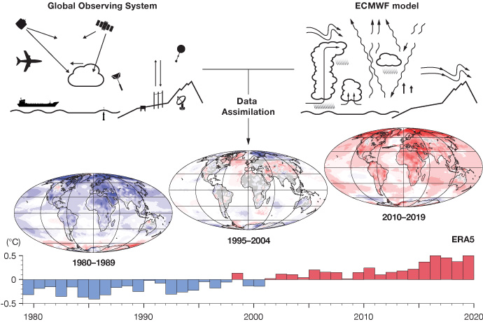 Reanalysis data provide the most complete picture currently possible of past weather and climate. They are a blend of observations with past short-range weather forecasts rerun with modern weather forecasting models. They are globally complete and consistent in time and are sometimes referred to as ‘maps without gaps’.
