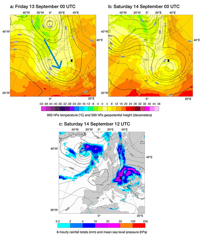 Figure 1: A synoptic overview of storm Boris. (a) 850 hPa temperature and 500 hPa geopotential height from the ECMWF Integrated Forecasting System (IFS) analysis at 00 UTC on 13 September; (b) as for (a), but for 00 UTC on 14 September; and (c) 6-hour rainfall (valid for 12 to 18 UTC) and mean sea-level pressure (from 12 UTC) on 14 September. The black hourglass symbol shows the location of Vienna.