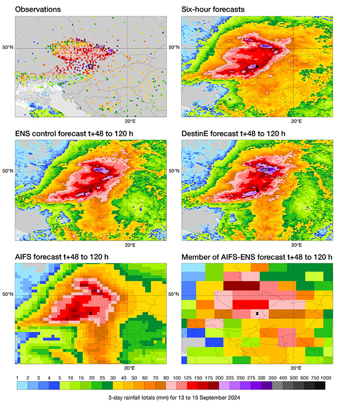 In addition to the ECMWF operational IFS, Figure 2 shows examples of forecasts produced for the EU’s Destination Earth (DestinE) initiative (4.4 km resolution), the ECMWF Artificial Intelligence Forecasting System (AIFS) (28 km resolution) and the AIFS ensemble (AIFS-ENS) (111 km resolution), here represented by the first perturbed member. The magnitude of the extreme rainfall in the worst-affected regions was best captured in the DestinE and operational ECMWF forecasts. The AIFS forecast captured the large-scale structure of the extreme but underestimated the amplitude, partly due to the lower resolution. As the AIFS ensemble is running with much lower resolution currently, the magnitude was missed but the general pattern was captured.