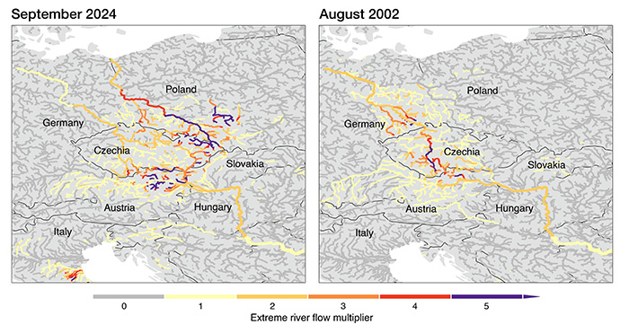 Figure 7: Extreme river flow multiplier for 12 to 21 September 2024 (left) and for 13 to 22 August 2002 (right). This index is the maximum 6-hourly river flow during the periods specified as a ratio of the average long-term (1992–2021) maximum 6-hourly river flow (in the LISFLOOD model climatology). Data: EFAS; credit: CEMS/ECMWF