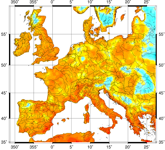 Metop-A ASCAT mean surface soil moisture product for 15-27 May 2011. A drought in parts of Europe in the spring of 2011 was accompanied by a rapid decrease in surface soil moisture between April and May. The ASCAT soil moisture product provides an estimate of water saturation of the 2-3 cm topsoil layer, in relative units between 0 and 100%. (Chart: EUMETSAT)