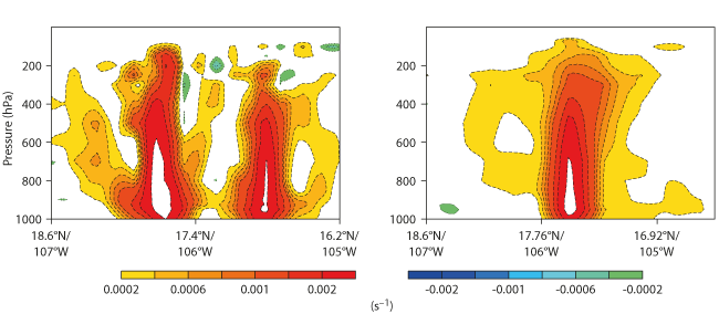 High-resolution analysis of relative vorticity (cross section) for Hurricane Patricia at 12 UTC on 23 October 2015 produced using the previous IFS cycle, 43r1 (left), and IFS Cycle 43r3 (right). The upgrade has removed the unrealistic double-core structure.