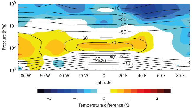 Difference in zonal (west–east) mean temperature between the new radiation scheme and the previous one (IFS Cycle 43r3 minus IFS Cycle 43r1 – shading) for a four-year coupled climate simulation. The contours show temperature in °C according to the climate simulation using IFS Cycle 43r3. The upgrade reduces the existing bias in the tropopause and the stratopause.