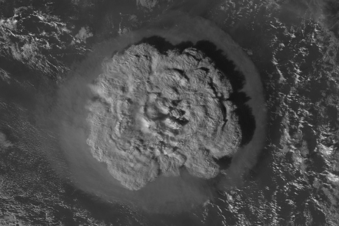 The Hunga Tonga eruption on 15 January 2022 recorded by Japan's Himawari-8 weather satellite. The plume was just under 500 km across. (Source: Japan Meteorological Society, CC BY 4.0)