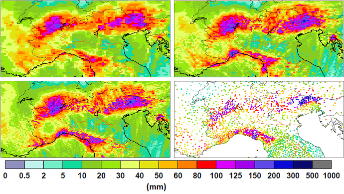 This image shows 78-hour forecasts of 24-hour precipitation on 30 October 2018, using the IFS at a grid spacing of 9 km (top left), 4 km (top right), and 2.8 km (bottom left). The bottom right-hand panel shows the available observations. They indicate that the higher-resolution versions of the IFS produce more accurate extreme precipitation values. A more complete evaluation is provided by the image below.