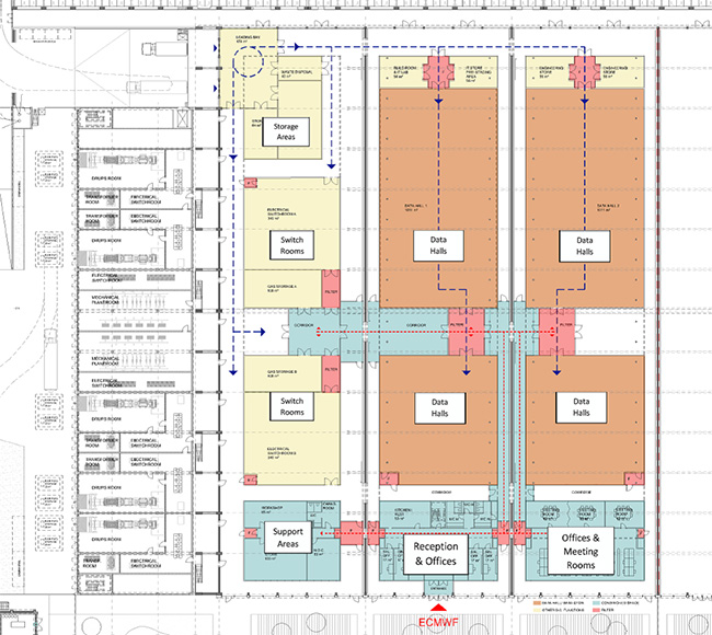 The image below shows the data centre layout that was given as an example of ECMWF’s requirements as set out in the Reference Concept Design Document.