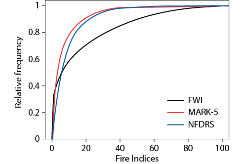 The reason for this is that the different models apply different responses of the vegetation to weather forcings. For example, the FWI system is specifically calibrated to describe the fire behaviour in a standard jack pine stand (Pinus banksiana) typical of Canadian forests. The NFDRS model, on the other hand, implements a full description of vegetation through fuel type characterization and explicitly calculates the moisture content of dead and living vegetation. It divides dead fuel into classes according to their fast or slow response to changes in atmospheric temperature and humidity forcing, while living fuel is divided into herbaceous and woody and shrubs. Contrary to the other two models, the MARK-5 model includes no explicit description of the evolution of moisture in different fuel types. Instead, danger conditions are simply evaluated on the basis of a generic drought index representing fuel availability, called the Drought Factor (DF).