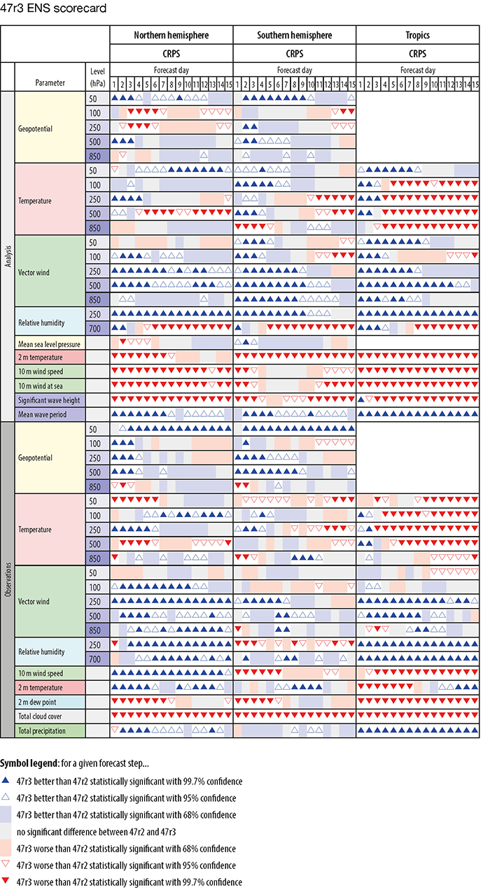 Figures 3 and 4 show medium-range scorecards for Cycle 47r3 relative to own analysis and observations, for the HRES and ENS, respectively (interactive scorecards are available from the 47r3 implementation web page: https://confluence.ecmwf.int/display/FCST/Implementation+of+IFS+Cycle+47r3). There are many positive impacts of the Cycle, particularly on upper-air scores and tropical cyclone tracks. There are also some deteriorations, and both are discussed below.