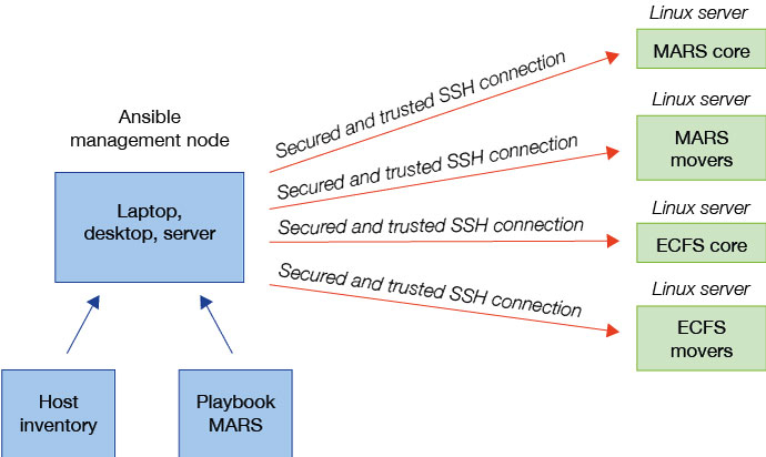Ansible has the concept of a control node and a managed node. The control node is where Ansible is executed from. Managed nodes are the devices being automated, for example a MARS mover server (see Figure 3).