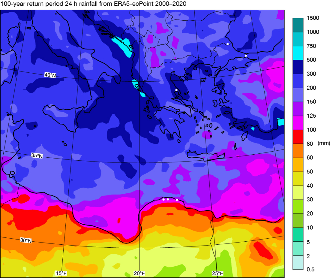 For option 5, we use ERA5-ecPoint output, a downscaled version of ERA5 that aims to deliver a probabilistic representation of rainfall at point scale (akin to gauge measurements) within each ERA5 grid box (see Botazzi et al., 2024). Insets in Figure 10a,b show 99th percentiles for point rainfall so derived, for 2 October 1959 and 10 September 2023 respectively. Whilst values in the latter case are clearly higher, in both instances observed values seem to be in range. Indeed, in the 1959 case, whilst 155 mm in Derna would rank as very unlikely, it was still rated a plausible outcome from the synoptic pattern parameters encapsulated in the ecPoint post-processing (~1% probability or slightly less). Finally, Figure 11 provides, from 21 recent years of post-processed ERA5-ecPoint data, a 100‑year return period (RP) estimate for 24 h gauge-based rainfall. Whilst other datasets could admittedly give different RP estimates, an advantage of ecPoint is that it allows n-year RPs to be estimated from m years of data, where n>>m, without using extreme value theory/tail parametrization. At the three marked sites in Libya, which provided data for the Daniel case, the value is about 125 mm, suggesting that observed rainfall for Daniel, and the Derna value for the 1959 case (Figures 10c,d), were indeed very extreme (RP > 100 years), particularly at Al Bayda in 2023 (RP >> 100 years). Interestingly, the 100‑year return period value for Al Bayda is almost identical to the values given by climate model downscaling in the Figure in Box A. However, the presence of strong gradients across northern Libya in Figure 11 also suggests that intrinsic uncertainty in these values is locally elevated. On top of this, we know that topographically-enhanced convection can be associated with systematic model rainfall biases (Hewson & Pillosu, 2021). Such factors should be taken into account should any such data ever be used for design specification.