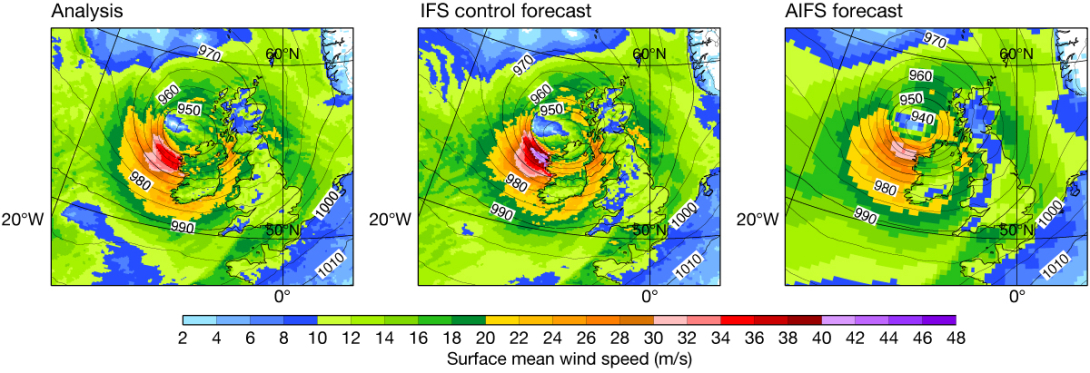 Storm Éowyn hit the west coast of Ireland in the early hours of 24 January 2025. According to Met Éireann, the storm (based on preliminary evaluation) broke the land records for Ireland of 10‑minute surface mean wind speed (142 km/h, 39.4 m/s) and wind gusts (184 km/h, 51.1 m/s) at the coastal station at Mace Head, County Galway. The storm caused widespread disruption in the Republic of Ireland and Northern Ireland and also affected Scotland later on. Ahead of the storm, Met Éireann issued red warnings for the whole country, and the UK Met Office did the same for Northern Ireland and parts of Scotland. 768,000 customers were without power in the Republic of Ireland, with nearly 326,000 customers affected in Northern Ireland. Estimates suggest that twice as many trees fell during the storm as there would normally be felled in a year. Here we present forecasts of the event provided by ECMWF’s Integrated Forecasting System (IFS) and Artificial Intelligence Forecasting System (AIFS).